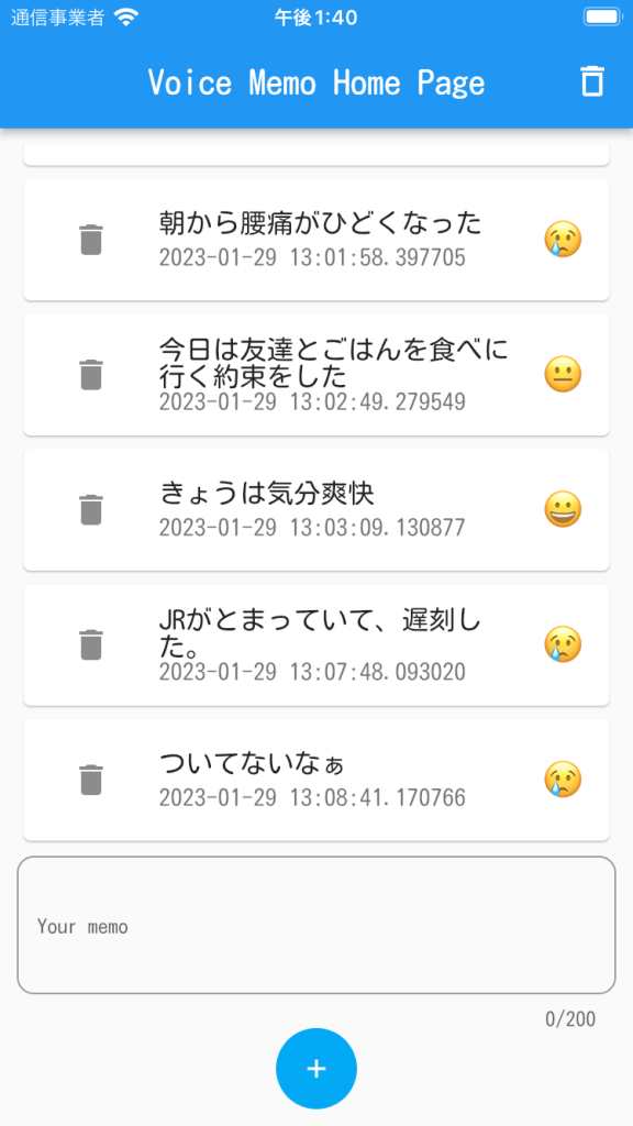 まず、Text Fieldを追加し、addボタンを押すことで、入力されたメモを追加することにしました。蛇足ですが、入力された文字列のSentiment分析をして、結果を顔文字で表現してみました。