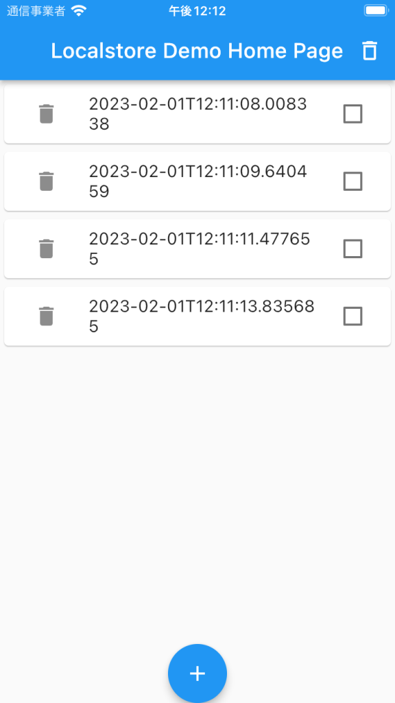 +ボタンをクリックすると、一つづつリストにカードが追加され,ボタンを押した時間が刻印されています。カードのゴミ箱をクリックすると、削除されます。アプリバーのゴミ箱をクリックすると、全削除となります。