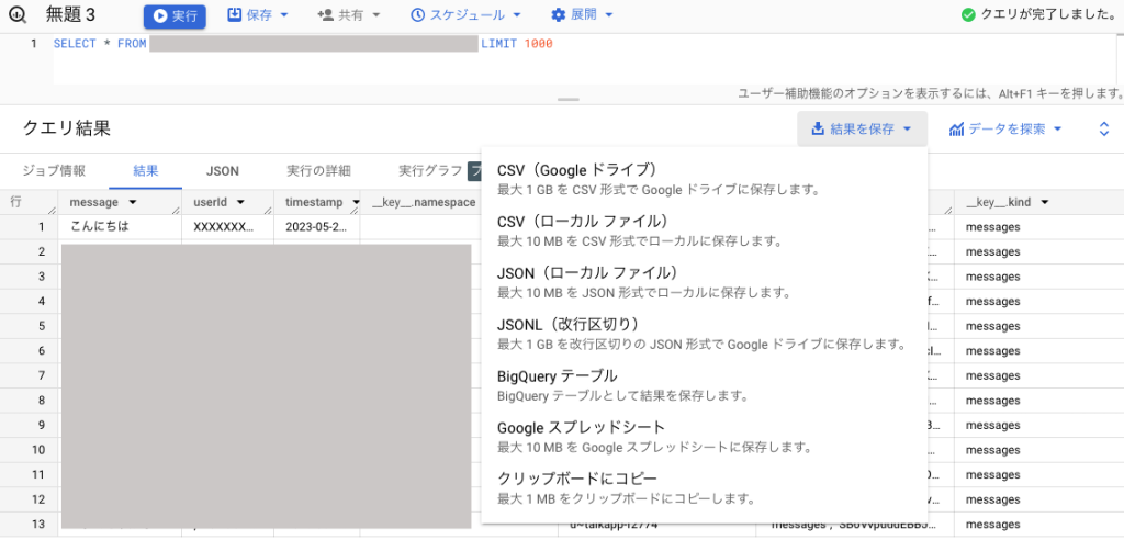 ローカルファイルにダウンロードしたい場合には、クエリを作成して「結果を保存」します。