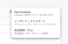 パネルビューの右肩の「Google cloudのその他の機能」から「インポート/エクスポート」を選択すると、GoogleCloudのfirestoreコンソールに遷移します。