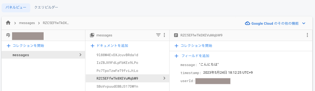 アプリからメッセージを送信すると、日付とuserIDとともにmessageがFirestoreに保存されます。