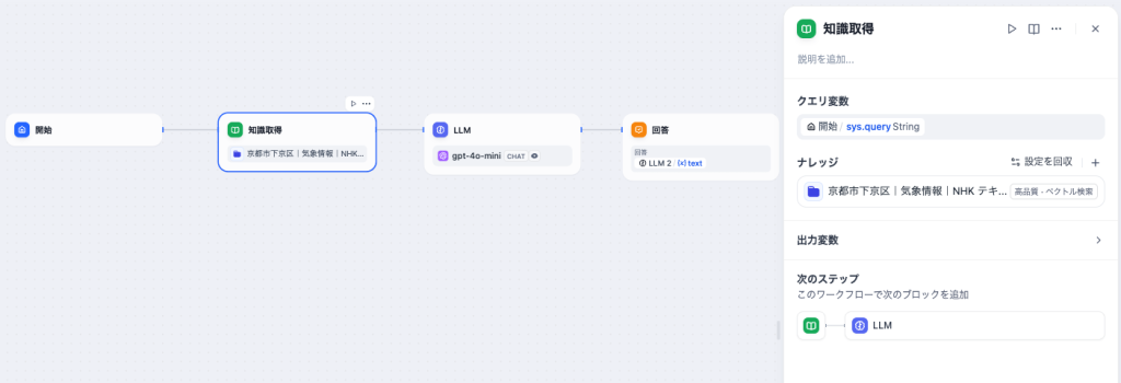 出来上がったChatflowのLLMの前に「知識取得」を挿入します。