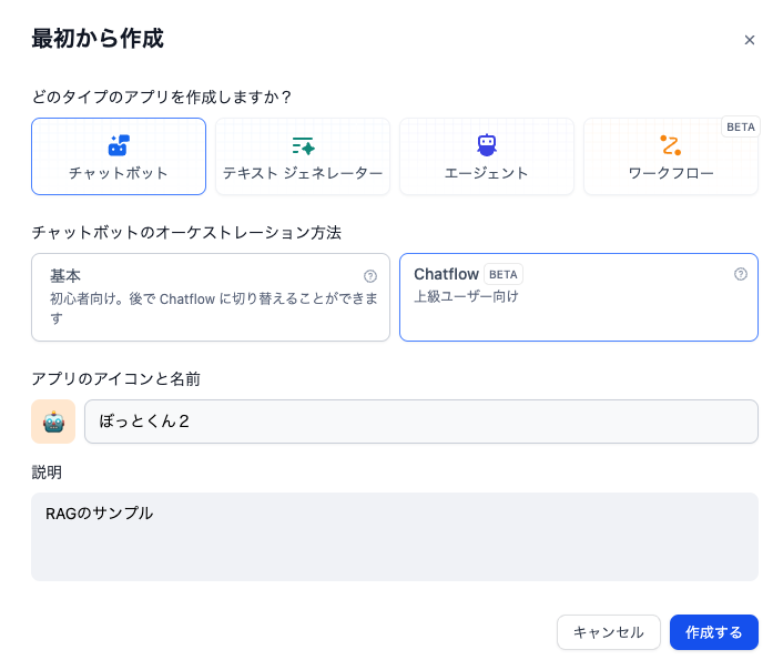 前回の記事では、基本のチャットボットを作成しましたが、今回は、Chatflow使います。