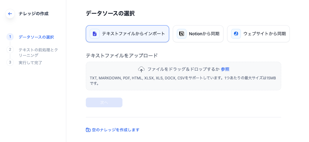 ちなみに、テキスト版以外のページだと表や画像が含まれていて、正しくナレッジ化できない可能性があるようです。ファイル形式はさまざまな形式をサポートしていますが、ナレッジにする段階で誤ってしまうといけませんので、できるだけ平文のテキストが良いかと思います。