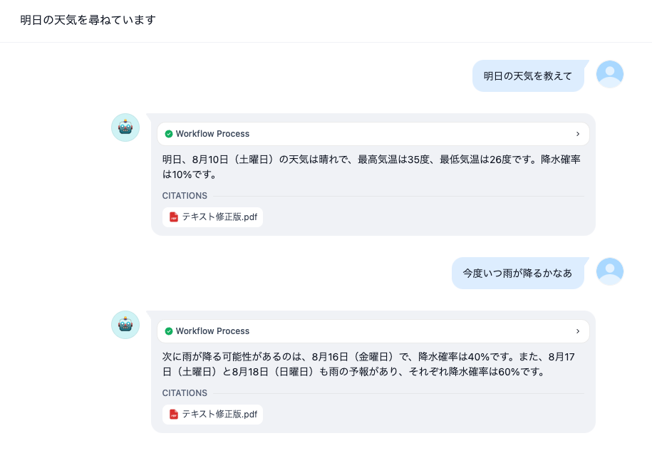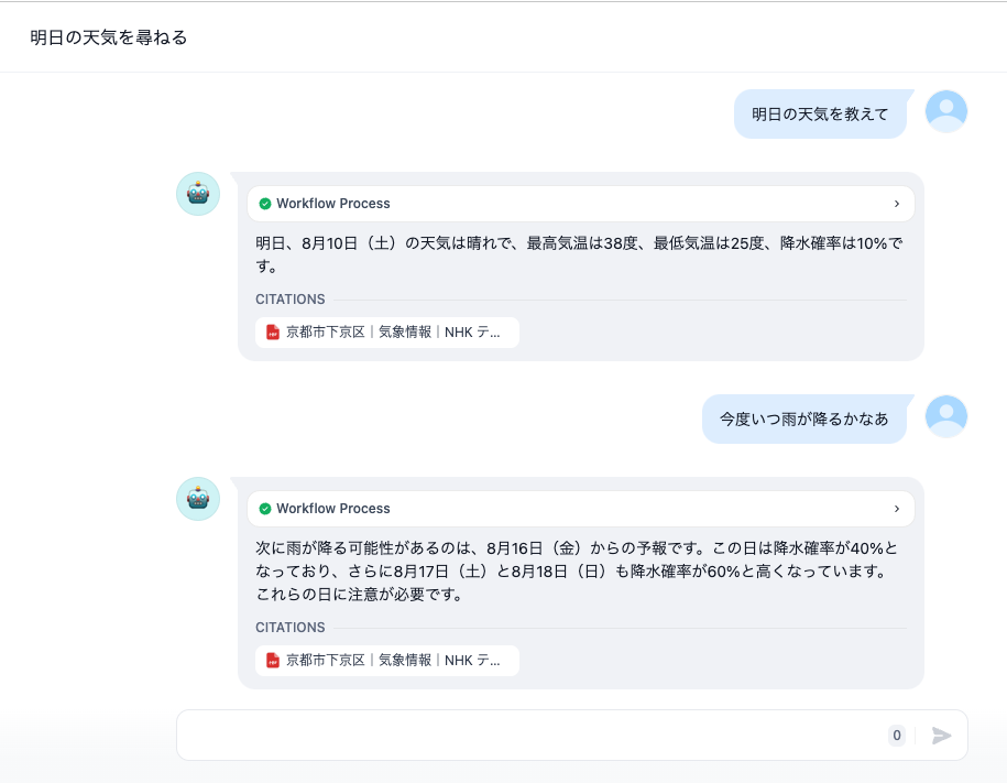 そこで、PDFのテキスト部分を抜き出し、手動で整形しました。具体的には、区切り線(ーー)を各データの間に入れて、日付とお天気データとの関係を明確にしました。すると、以下の様に正しい回答を得ることができました。
