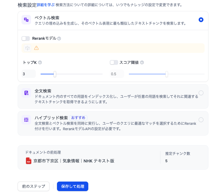 知識取得を選択して、ナレッジに先ほど追加したドキュメントを追加します。