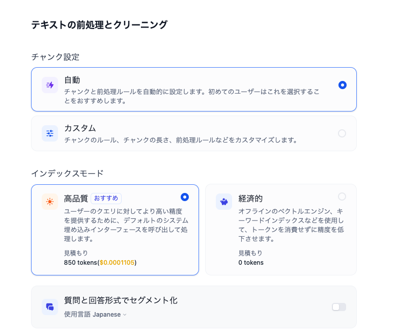 次に、「テキストの前処理とクリーニング」を行いますが、これはすべてデフォルトで行いました。