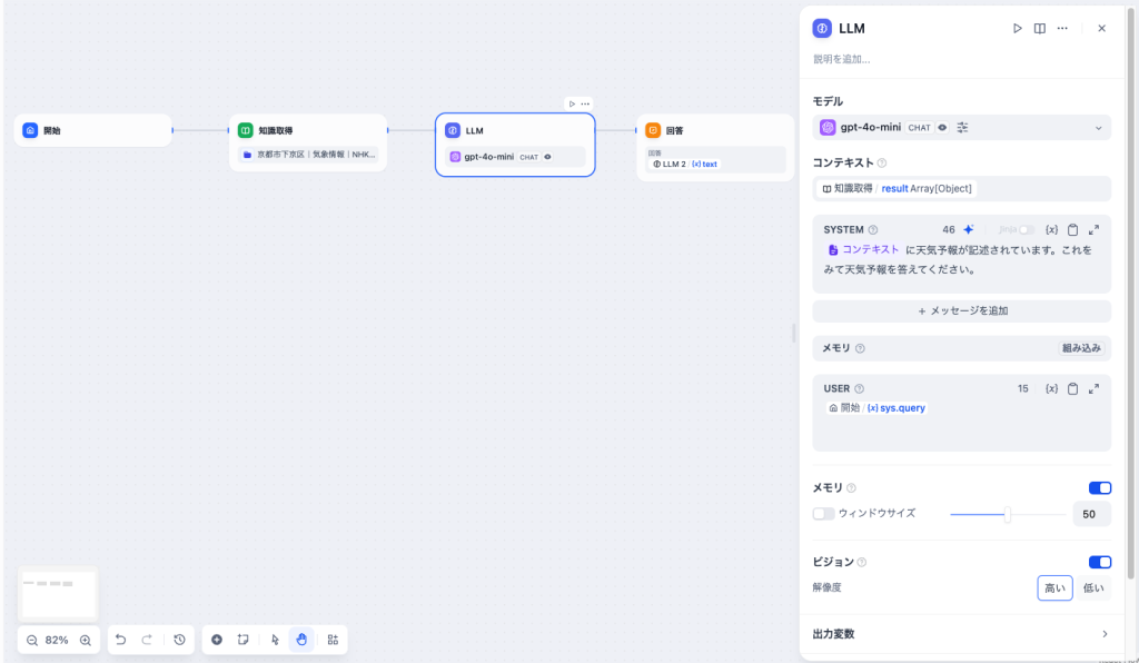 LLMでは、コンテキストに「知識取得」のresultを追加し、コンテキストを使って、SYSTEMプロンプトを記述します。